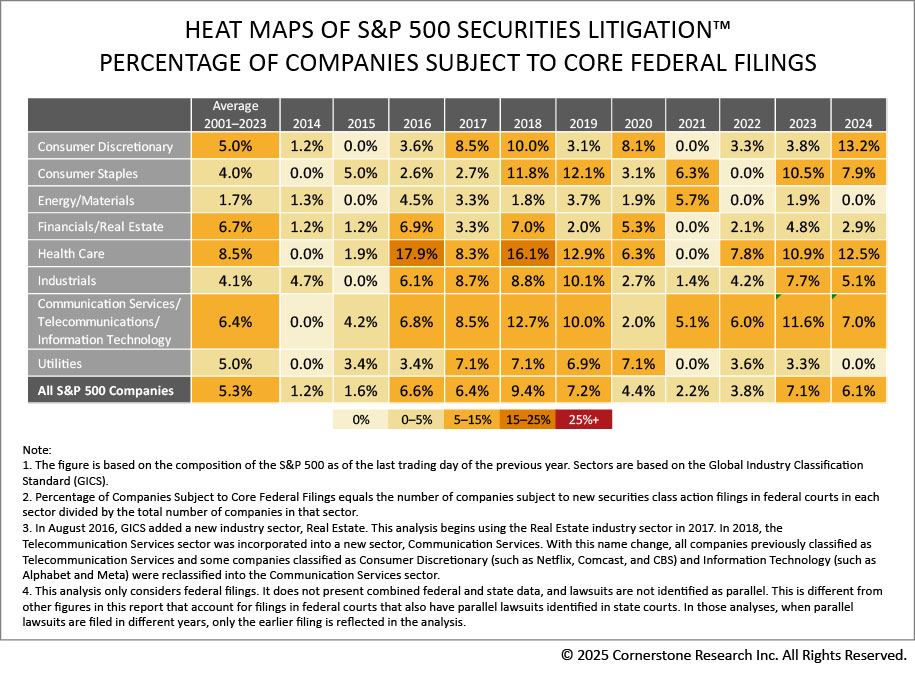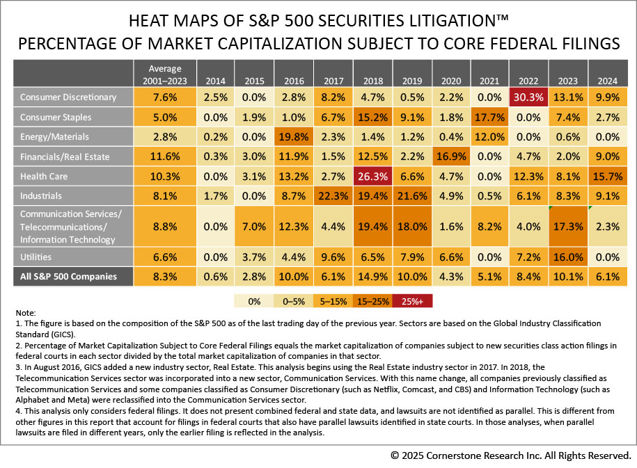 Heat Maps of S&P 500 Securities Litigation™ is a unique and proprietary method of financial and economic research and expert analysis, created and provided exclusively by Cornerstone Research in connection with, and as part of, its financial consulting and litigation support services. The Heat Maps of S&P 500 Securities Litigation™ analyze securities class action activity by industry sector. The analysis focuses on companies in the Standard & Poor's 500 (S&P 500) index, which comprises 500 large, publicly traded companies in all major sectors. Starting with the composition of the S&P 500 at the beginning of each year, the Heat Maps examine each sector by: (1) the percentage of these companies subject to new securities class actions in federal court during each calendar year, and (2) the percentage of the total market capitalization of these companies subject to new securities class actions in federal court during each calendar year.