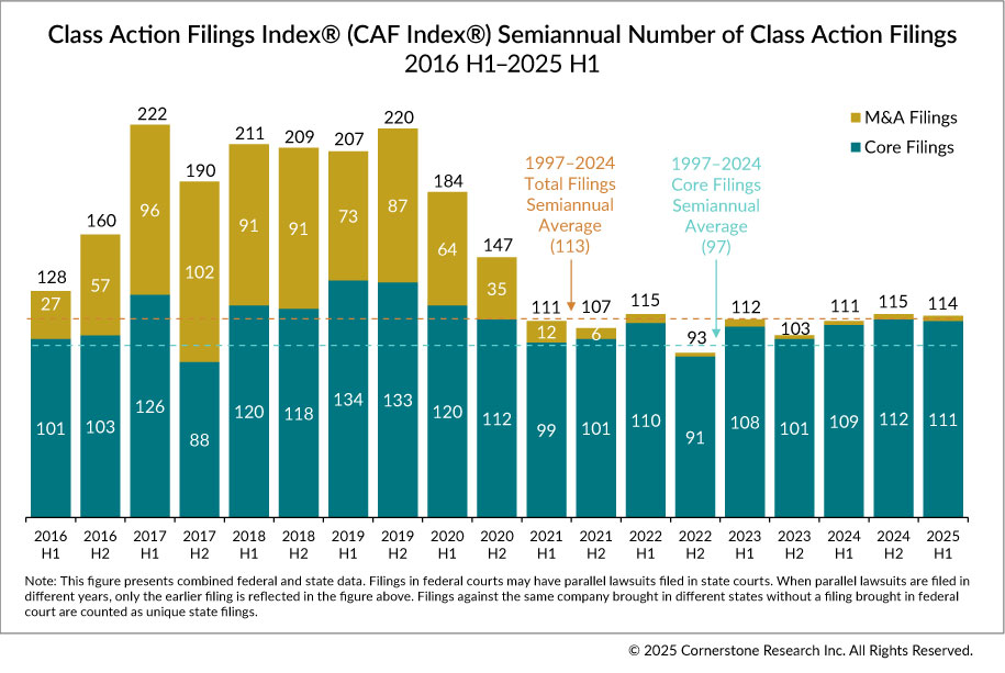 Class Action Filings Index® (CAF Index®) is a unique and proprietary method of financial and economics research and expert analysis, created and provided exclusively by Cornerstone Research in connection with, and as part of, its financial consulting and litigation support services. The methodology begins by parsing all securities class action filings into a "classic filings" sample that excludes IPO allocation, analyst, and mutual fund filings. The CAF Index® then sorts federal securities class action filings into categories according to whether they are related to the Credit Crisis, Chinese Reverse Mergers, Mergers and Acquisitions, or traditional filings. To avoid any double counting, the CAF Index® consolidates multiple filings related to the same allegations against the same defendant(s) through a unique record indexed to the first identified complaint. The CAF Index® is of great value to lawyers, expert witnesses, and economic consultants in legal proceedings and in settlement negotiations related to securities fraud class actions.