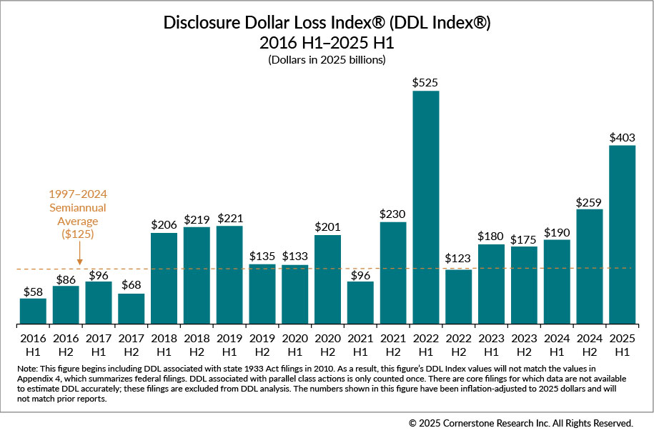 Disclosure Dollar Loss Index® (DDL Index®) is a unique and proprietary method of financial and economics research and expert analysis, created and provided exclusively by Cornerstone Research in connection with, and as part of, its financial consulting and litigation support services. The DDL Index® measures the value change in a defendant firm's market capitalization between the trading day immediately preceding the end of the class period and the trading day immediately following the end of the class period. The DDL Index® estimates the impact of all information revealed during or at the end of the class period. The DDL Index® is of great value to lawyers, expert witnesses, and economic consultants in legal proceedings and in settlement negotiations related to securities fraud class actions.