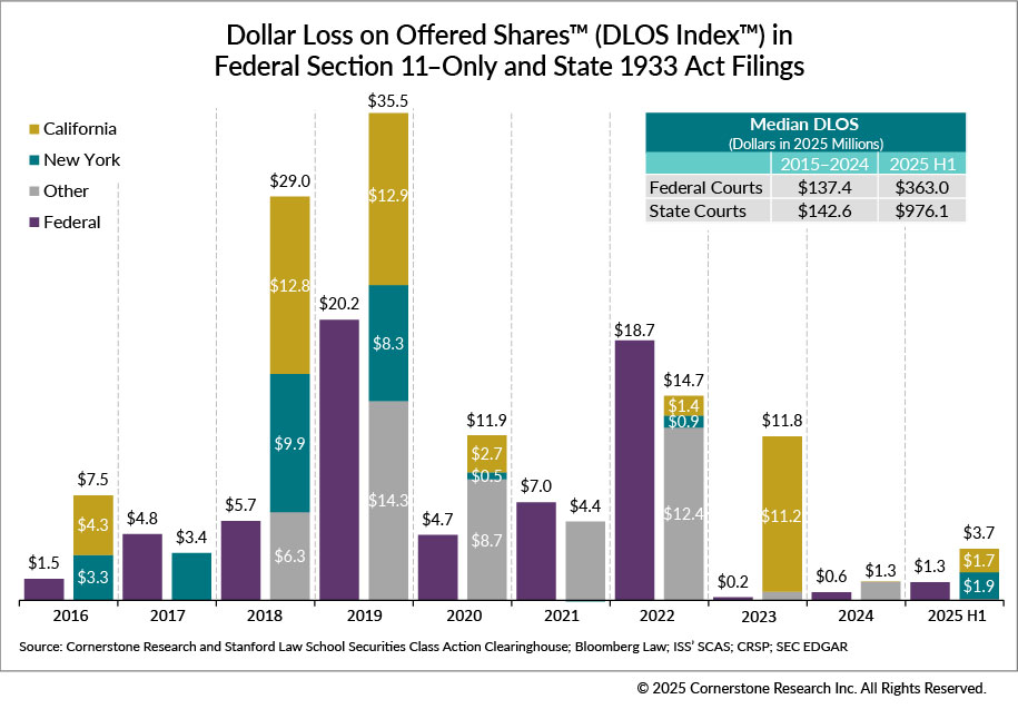 Dollar Loss on Offered Shares Index™ (DLOS Index™) is a unique and proprietary method of financial and economics research and expert analysis, created and provided exclusively by Cornerstone Research in connection with, and as part of, its financial consulting and litigation support services. The DLOS Index™ measures the aggregate change in value of shares acquired by class members (federal filings with only Section 11 claims and for state 1933 Act filings). It is the difference in the price of offered shares (i.e., from offering until the complaint filing date) multiplied by the shares offered. The DLOS Index™ should not be considered an indicator of liability or measure of potential damages. Instead, it estimates the impact of all information revealed between the IPO date and the complaint filing date, including information unrelated to the litigation.