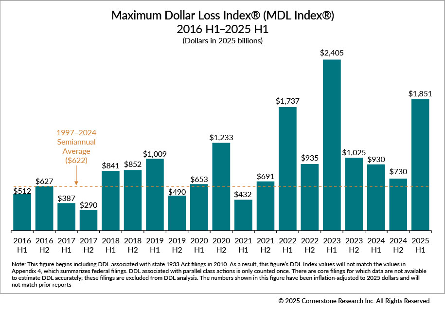 Maximum Dollar Loss Index® (MDL Index®) is a unique and proprietary method of financial and economics research and expert analysis, created and provided exclusively by Cornerstone Research in connection with, and as part of, its financial consulting and litigation support services. The MDL Index® measures the aggregate change in value for all federal and state filings for the defendant firm's market capitalization from the trading day with the highest market capitalization during the class period to the trading day immediately following the end of the class period. MDL should not be considered an indicator of liability or measure of potential damages. Instead, it estimates the impact of all information revealed during or at the end of the class period, including information unrelated to the litigation.